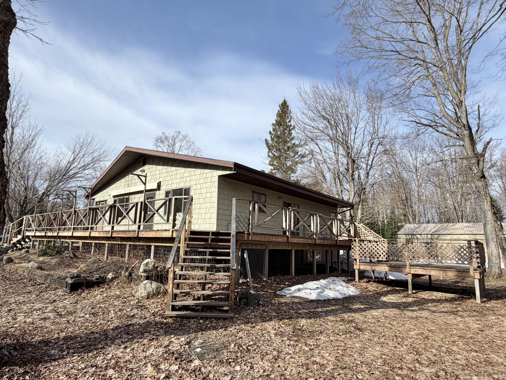 Resting on 9 wooded acres, this 4 bedroom, 3 bath raised ranch offers privacy & space to enjoy. The home features an easy flow layout & a full finished basement, providing extra living area for relaxing, entertaining, or guests. Step outside to a spacious deck spanning two sides of the home with a retractable awning, perfect for taking in the peaceful setting. Enjoy the pellet stove providing warmth & comfort throughout the home. Also included, is a dedicated primary suite for extra privacy with access to the secluded back deck. A circle driveway adds everyday convenience, & a large pole building garage, with a workshop, and multiple outbuildings offers great space for storage, hobbies, or projects. Offering a great opportunity to add your own personal touches. Be the Next UP Move Made!